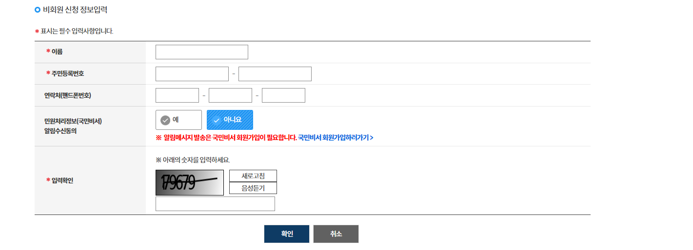 - 회원 신청과 비회원 신청이 있는데 저는 비회원 신청을 하겠습니다. (수집 동의와 신청인 정보입력을 합니다)