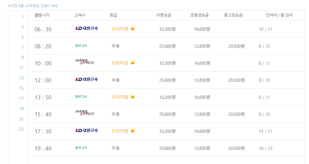 - 시간대 순으로 버스 고속사(회사이름), 등급, 할인, 잔여석 등 기능이 나옵니다.