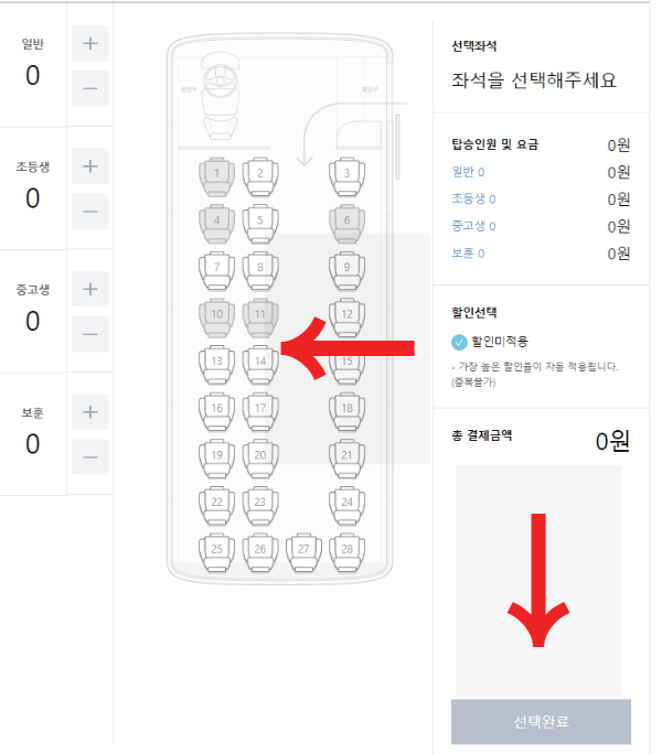 - 일반, 초등생 등 알맞은 인원을 선택한 후 원하는 좌석을 선택하고 선택완료를 누릅니다. (회색은 이미 사람이 선택한 자리라 흰색으로 빛나는 좌석을 선택하면 됩니다.)