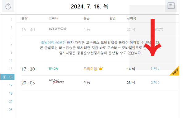 - 시간대 순으로 버스 고속사(회사이름), 등급, 할인, 잔여석 등 기능이 나옵니다.