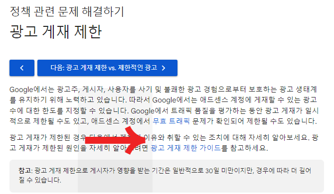 - 광고 게재가 제한된 원인을 자세히 알아보러면 ' 광고게재 제한 가이드'를 참고하라고 해서 눌러봤습니다.