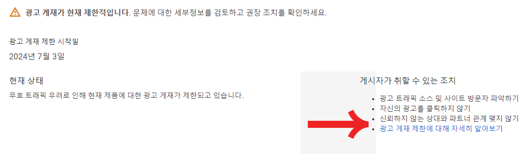 - '광고 게재 제한에 대해 자세히 알아보기'를 눌러줍니다.