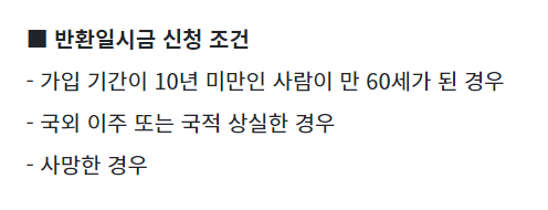 - 구비서류 : 반환일시금 지급청구서, 신분증 사본, 수급권자 예금계좌, 도장(서명가능), 해당사유별 추가 구비서류