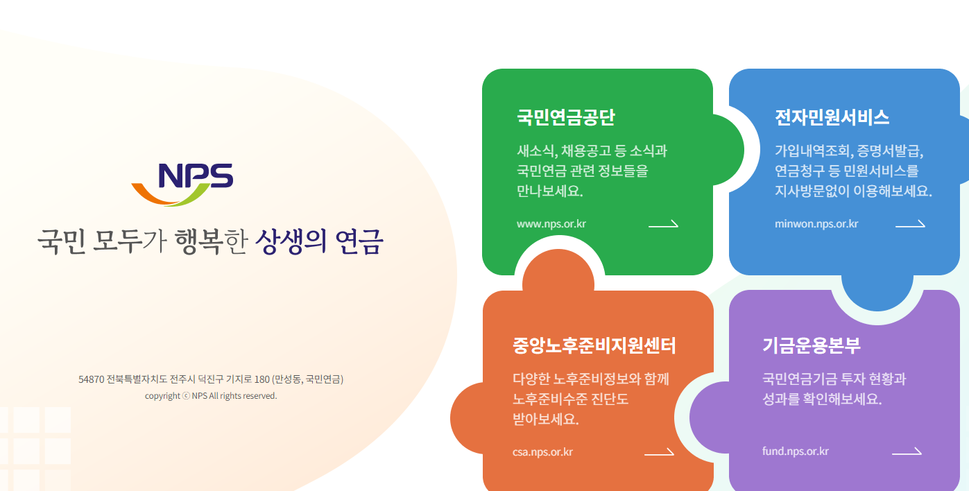 이외에도 국민연금공단에서는 개인 및 사업자 신고, 신청, 조회, 증명서 발급 및 탈퇴, 해지 등 문의 서비스를 제공하고 있으며, 온라인으로 직접 진단해 볼 수 있는 노후준비서비스도 제공하고 있습니다.