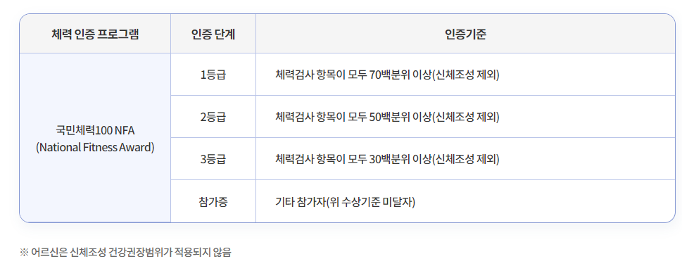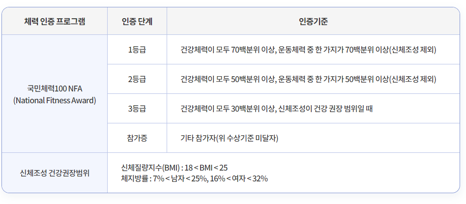 성별, 연령별 각 검사 항목의 백분위와 외국의 체력 인증 단계를 참고하여 다양한 스포츠에 도전하여 활력적이고 주도적으로 활동할 수 있는 체력수준(1등급), 활발한 신체활동 참여에 필요한 체력수준(2등급), 최소한의 건강 유지에 필요한 체력수준(3등급)으로 인증등급이 개발되었습니다.