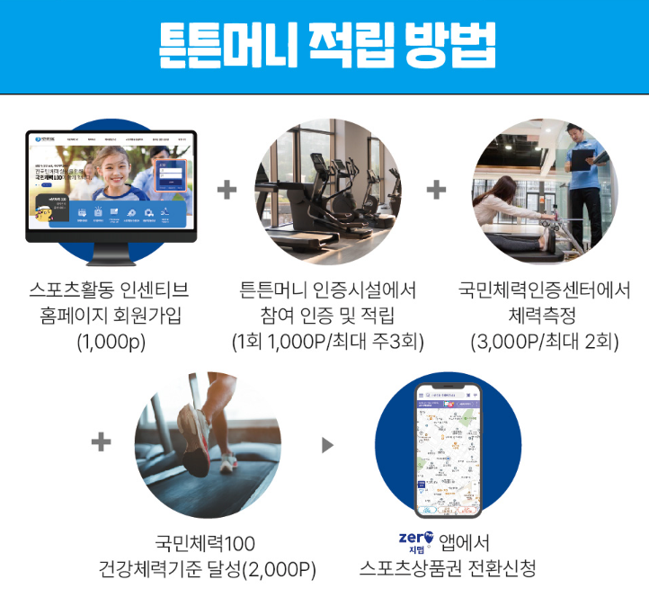 스포츠활동 인센티브로써, 스포츠활동에 참여 인증하면 튼튼머니를 적립하여 스포츠용품 구매와 스포츠시설 등록, 약국과 병원에서 사용할 수 있는 스포츠복지 서비스입니다. 참여대상으로는 11세 이상 전 국민이 대상입니다.