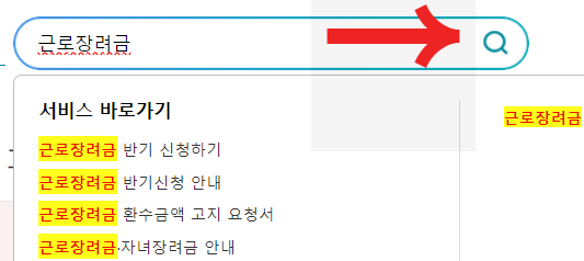 - 검색창에 근로장려금을 신청하고 옆에 돋보기를 눌러줍니다.
