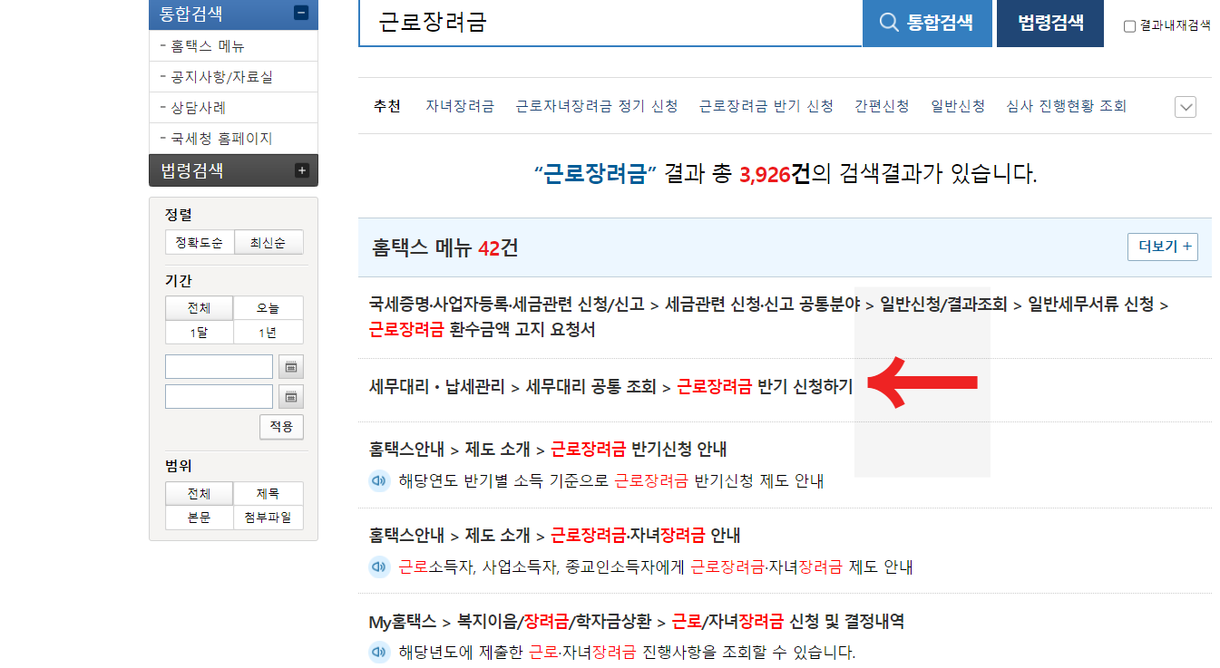 - 근로장려금 관련 항목들이 쭉나오는데 그 당시에 신청하는 항목을 눌러줍니다 (근로장려금 정기 또는 반기 신청하기)