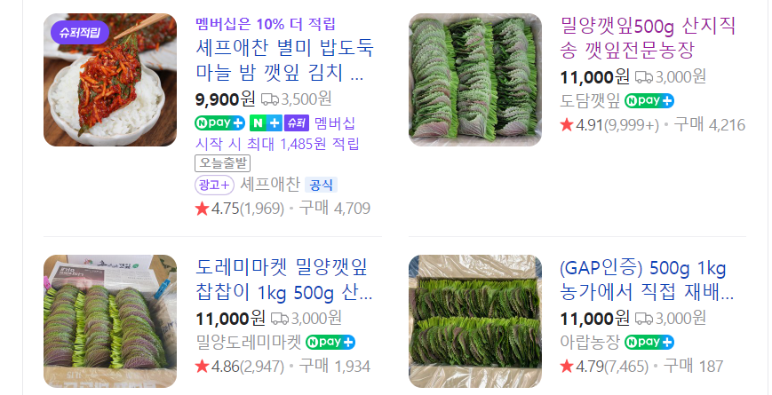 대표로 깻잎의 가격을 비교해 보겠습니다.