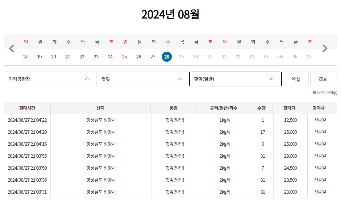 - 네이버 평균 가격이(같은 밀양 깻잎 기준) 500g에 11000원, 2kg로 계산하면 44000원이 되지만, 농협 공판장 인터넷 통합 거래시스템 경매가격은 2kg에 25000이면 구매가 가능하기 때문에 절반보다 조금 더 비싼 가격으로 구매가 가능한 수준입니다.