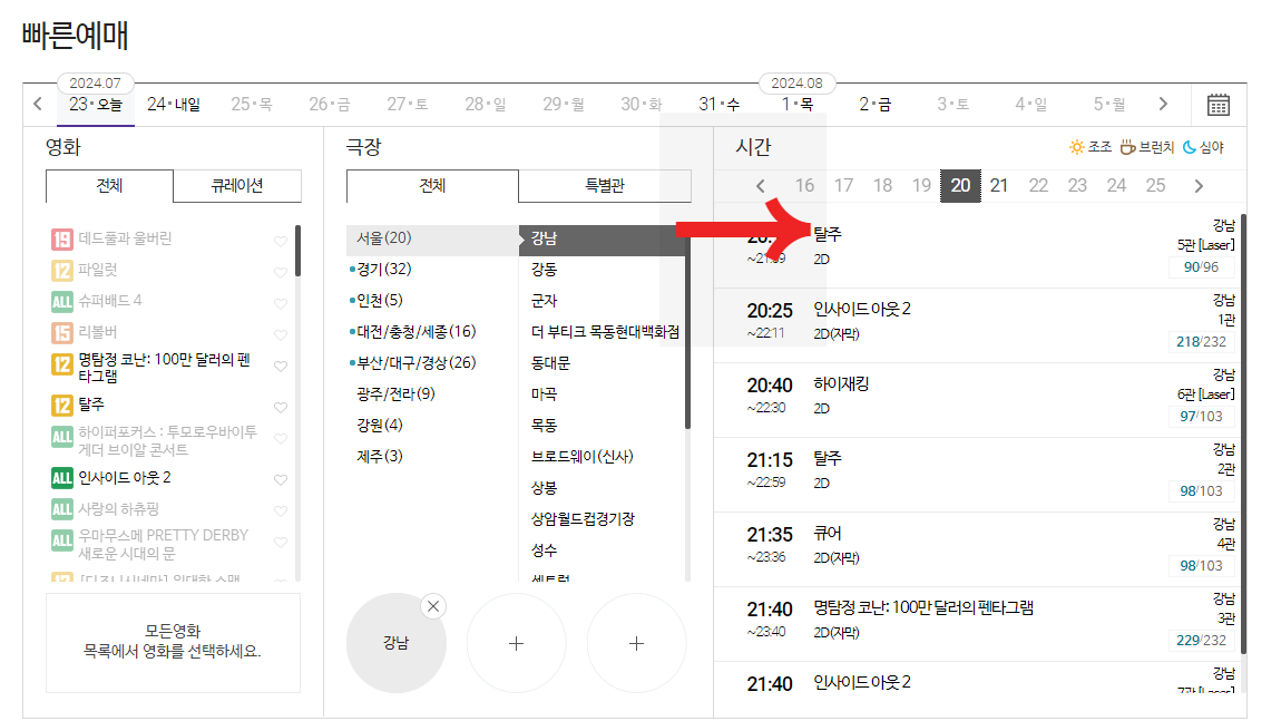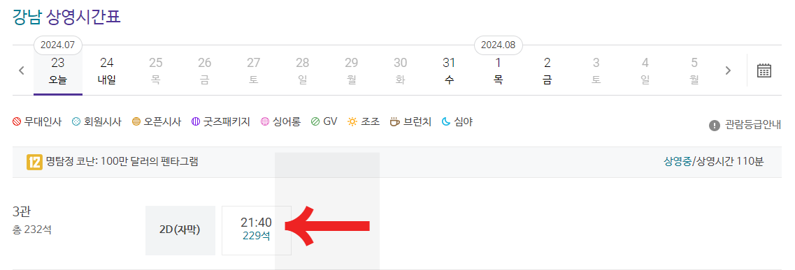 - 원하는 상영시간을 확인해 주시면 되는데, 상영시간표에 나오지 않는다면 요일이나 지점을 다시 확인해 주시길 바랍니다.