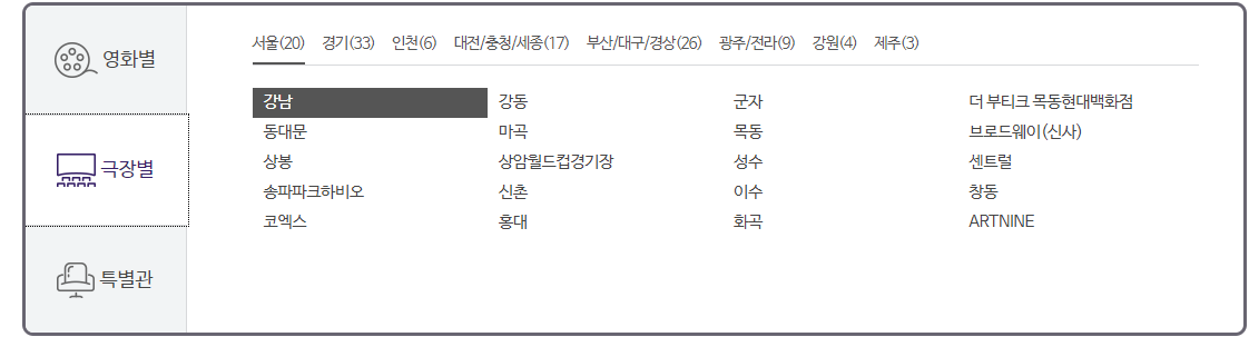 - 좌측 상단에 영화별, 극장별, 특별관 분류가 되어있습니다.