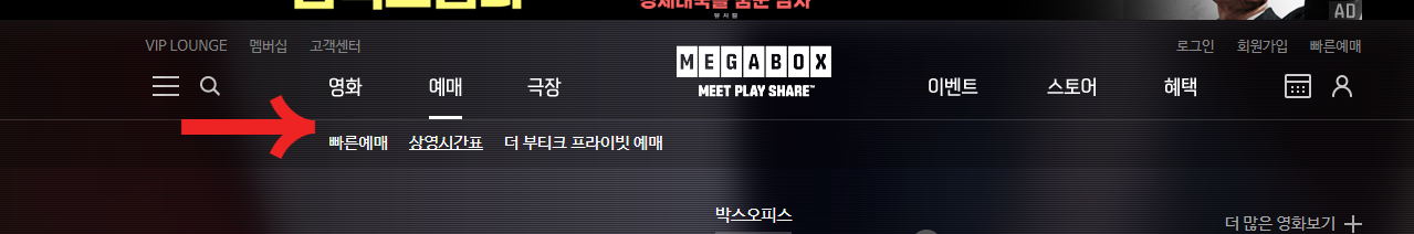- 맨 위 상단 카테고리 중 빠른 예매, 상영시간표, 더부티크 등이 있는데 이 중 빠른 예매를 눌러줍니다.
