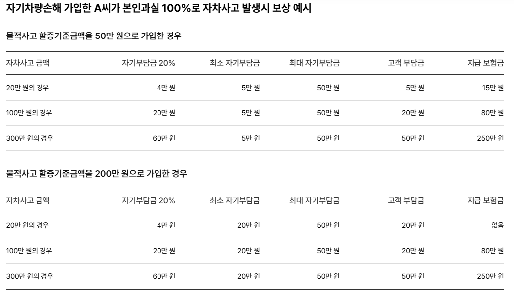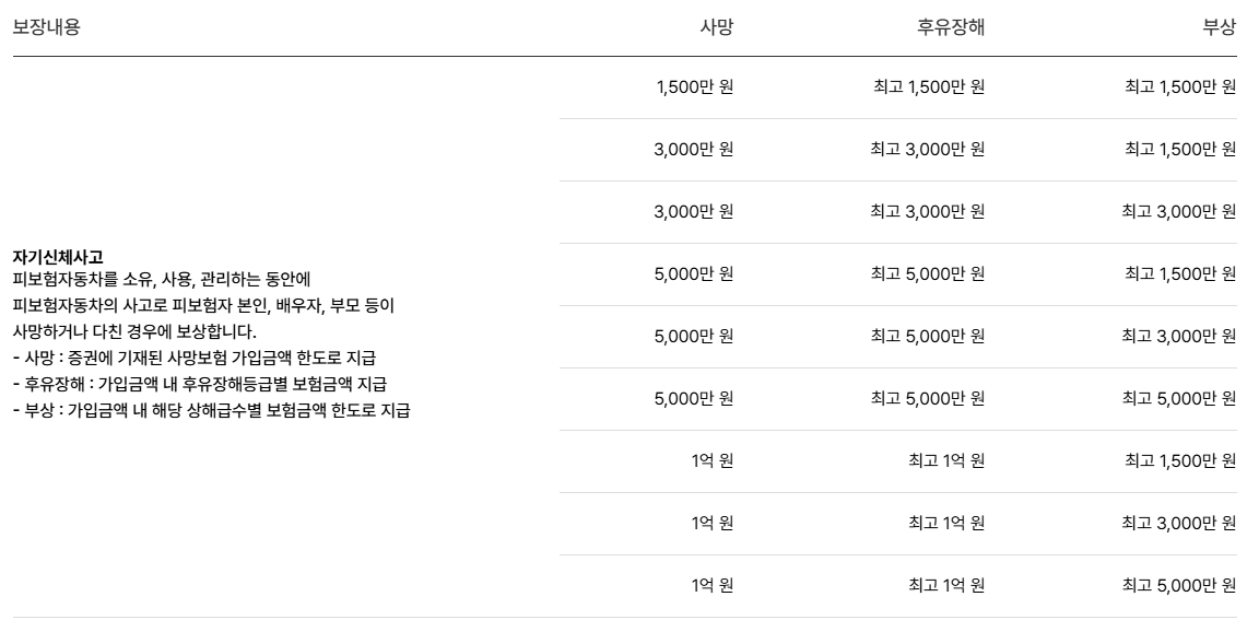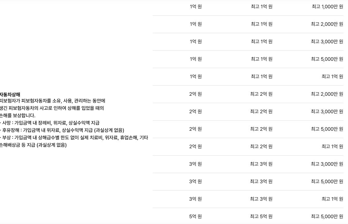 - 피해자 1인당 무한, 3억 원, 2억 원, 1억 원, 5,000만 원 중 한 가지를 택할 수 있습니다.