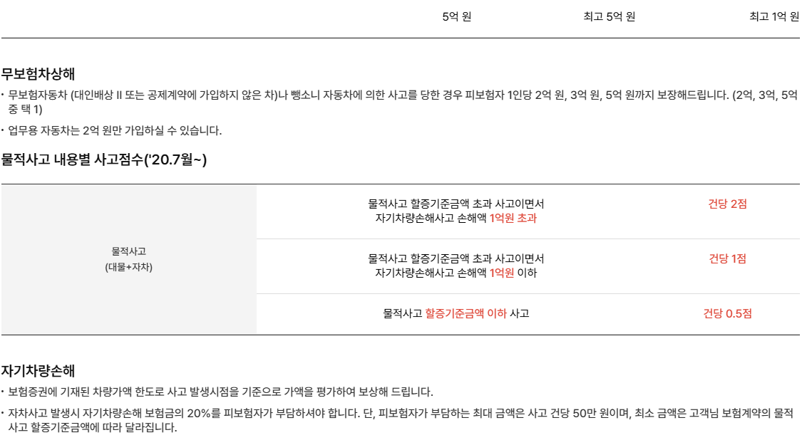 - 업무용 승합1,2종, 화물1,2,3종, 건설기계, 특수작업용/특정용도자동차는 5억 원, 10억 원을 가입하실 수 없습니다.