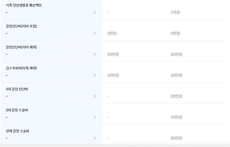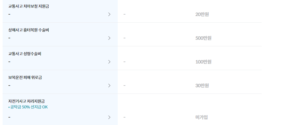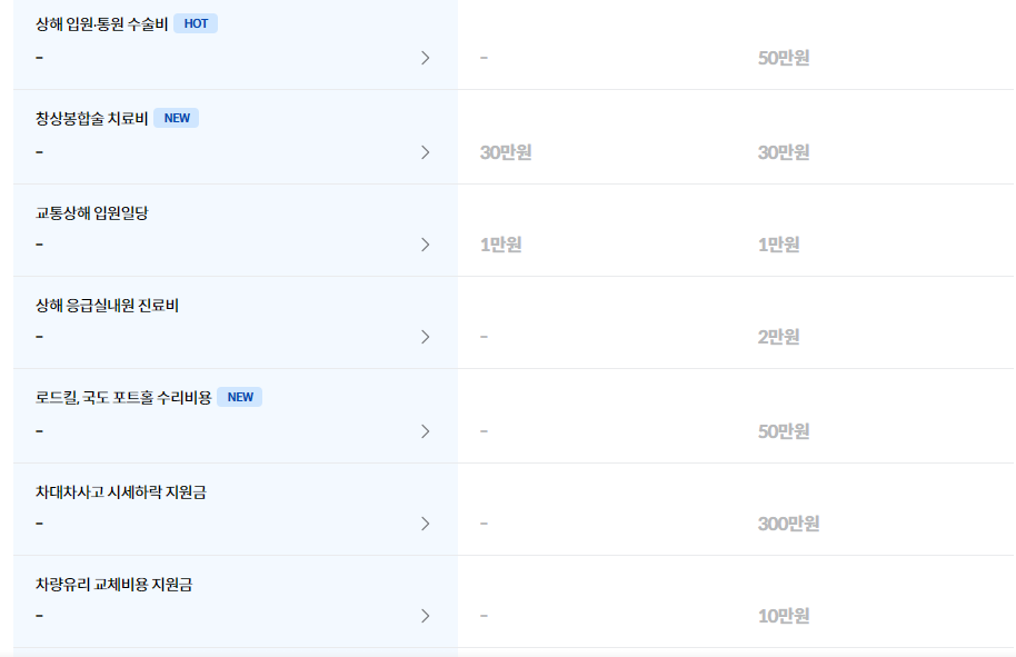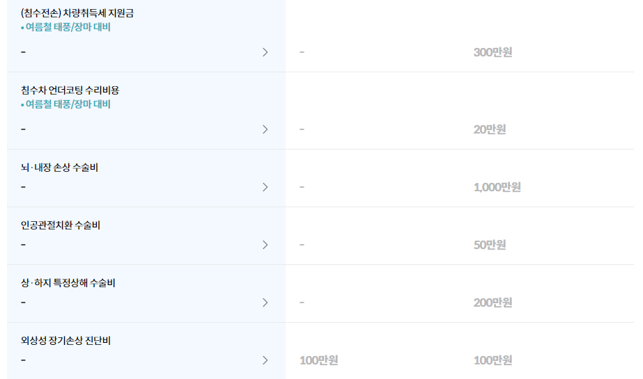 위와 같이 6개를 보장하며, 비싼 상품을 가입할수록 아래의 보장내용이 추가됩니다.