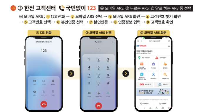 - 한전 고객센터로 문의(국번 없이 123)하시면 전기요금 고객번호 확인이 가능