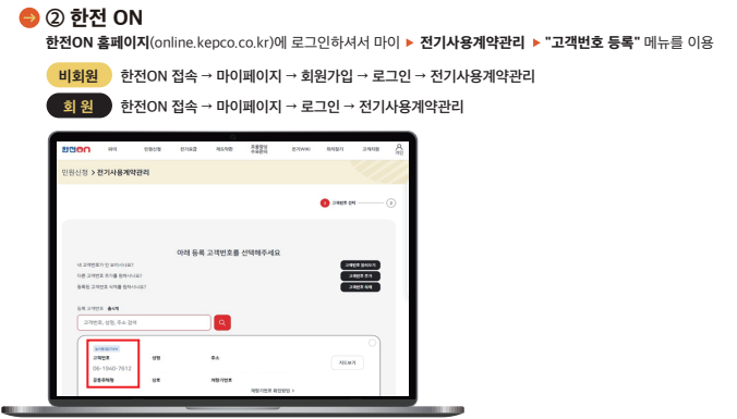 - 고객번호를 모르는 경우 한전 홈페이지(online.kepco.co.kr) 또는