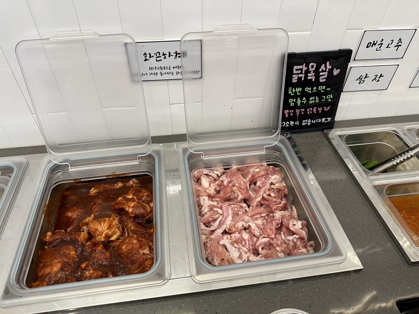소금구이(담백하계), 간장으로 양념된 구이, 매운 양념인 화끈하계, 닭목살이 있었습니다.