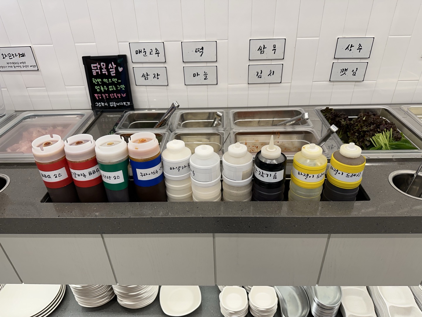 셀프바 야채코너 앞에 찍어 먹을 수 있는 양념이 이렇게 배치되어 있습니다.