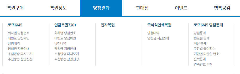 - 등수, 당첨조건, 당첨금, 당첨결과 몇 명이 되었는지 등의 정보를 알 수 있습니다.
