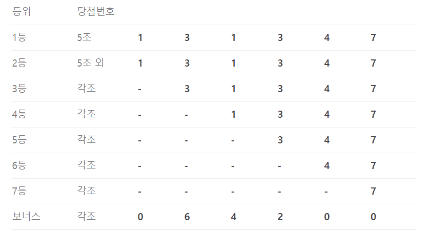 - 조만 다르고 뒤에 번호가 다 같은 복권은 2등입니다. 예를 들면 1조 또는 2조 또는 5조를 제외한 나머지 조 1,3,1,3,4,7입니다.