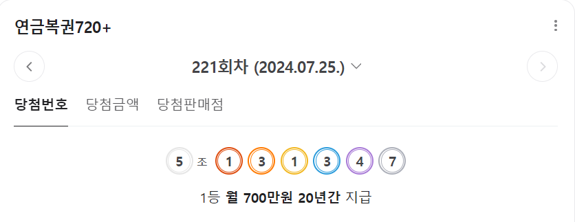연금복권 720 221회자 당첨번호 (2024.07.25)