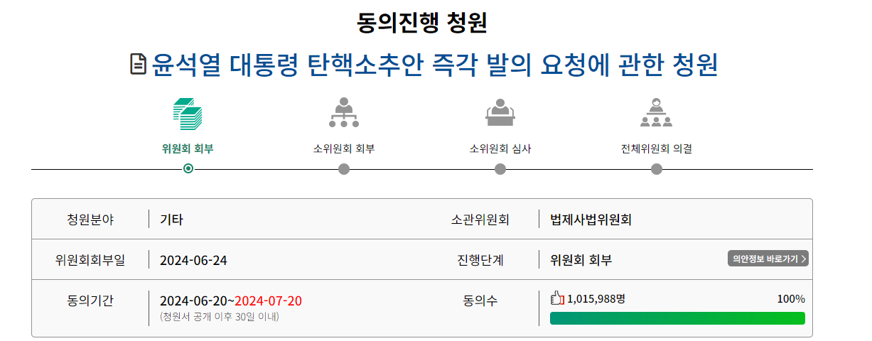 윤석열 대통령 탄핵소추안 발의를 요구하는 국회 국민동의 청원에 대한 동의가 7월 3일 오전에 100만명을 넘었습니다. 24일 국회 홈페이지를 통해 게시됐는데, 하루 평균 10만명 이상 동의를 받은 것입니다. 그럼 탄핵을 주장하는 사람들의 이유와 국회청원방법은 무엇인지 알아보겠습니다.
