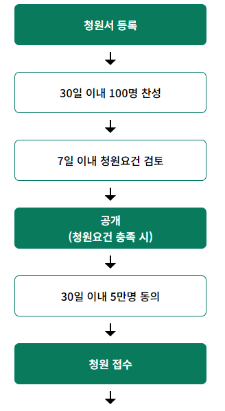 국민동의청원은 국민동의청원 홈페이지를 통하여 30일 동안 5만명의 국민의 동의를 받아 제출할 수 있습니다. 의원소개청원은 국회의원의 소개를 받아 제출양식을 작성하여 국회사무처 국회민원지원센터에 직접 방문 제출하거나 소개의원실을 경유하여 제출하시면 됩니다.