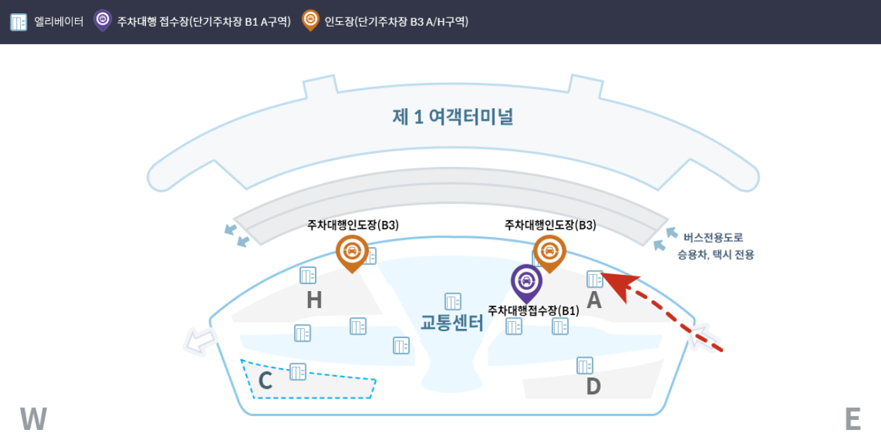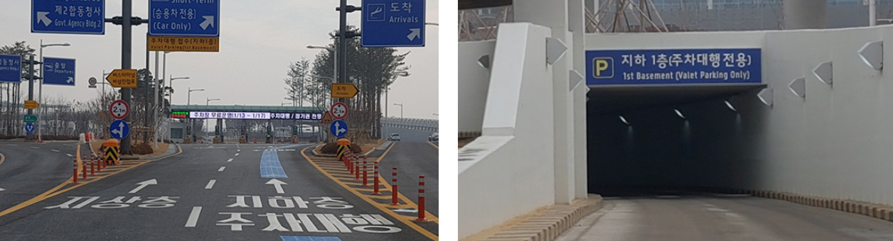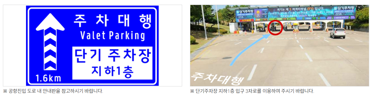 - 차량 맡길 때 : 여객터미널 도착(제2여객터미널 단기주차장 진입) > 공식주차대행 접수장으로 이동(단기주차장 지하1층 서편 진입부에 위치한 공식주차대행 접수장으로 이동) > 차량인계 및 접수증 교부(차량인계 및 모바일 접수증을 교부받기)