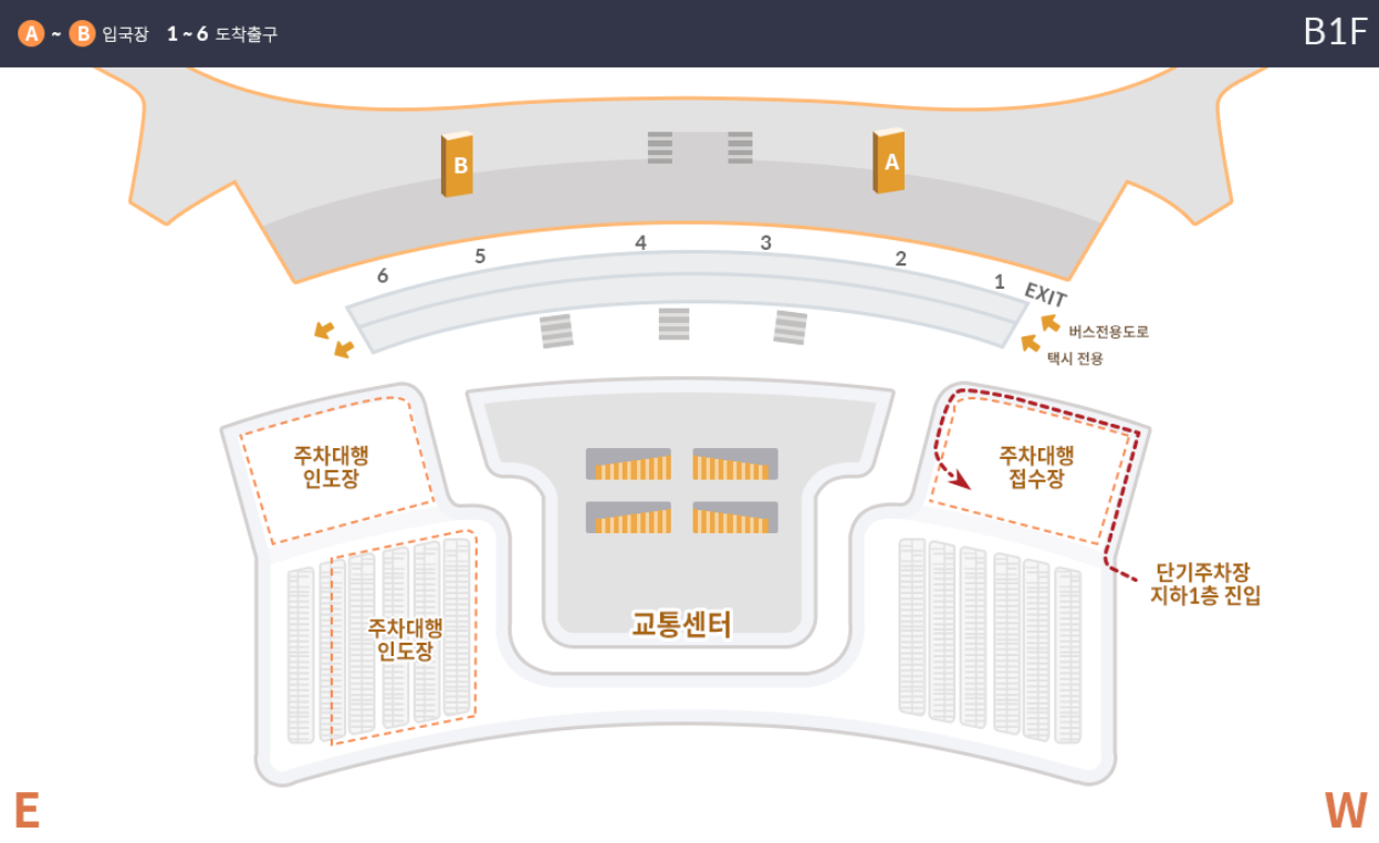 - 차량 맡기는 방법 : 단기주차장 입차(지하 1층) > 접수장 이동(단기주차장입구 3차로 이용 후 지하1층 A구역) > 차량 인계 및 접수증 교부(모바일 확인 문자 발송)