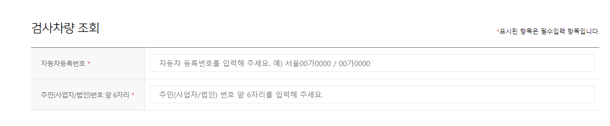 • 개인정보 수집 안내에 동의를 누르고 검사차량 조회칸에 자동차등록번호, 주민번호 앞 6자리를 입력합니다.