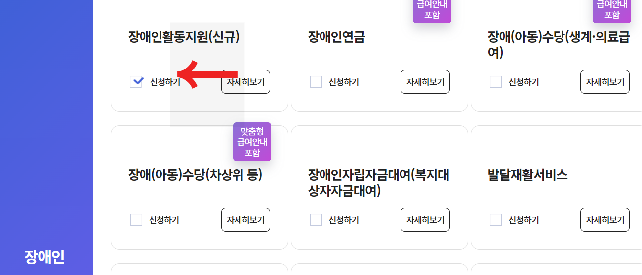 - 아래 장애인 항목에 원하는 서비스를 신청하기를 누른다음