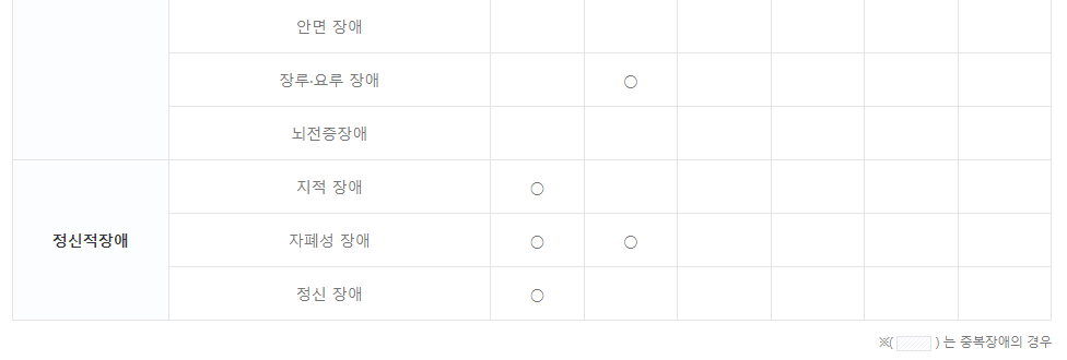 - 지적장애 : 의료기관의 정신과·신경과 또는 재활의학과 전문의