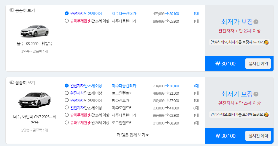 올뉴k3 18~19년식 3만원, 더뉴아반떼23~24년형 32400원이고, 제주특별자치도 지정 18~25년 8년 연속 우수관광업체 선정이라고 합니다.(25년꺼를 미리 뽑나?) 만족한다는 후기가 많습니다.