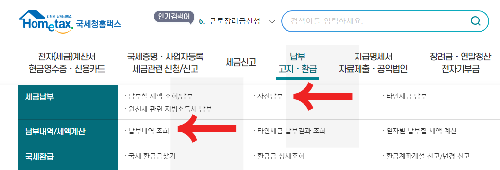 - 납부고지/환급 부분에서 납부할 세액 조회/납부를 눌러줍니다.