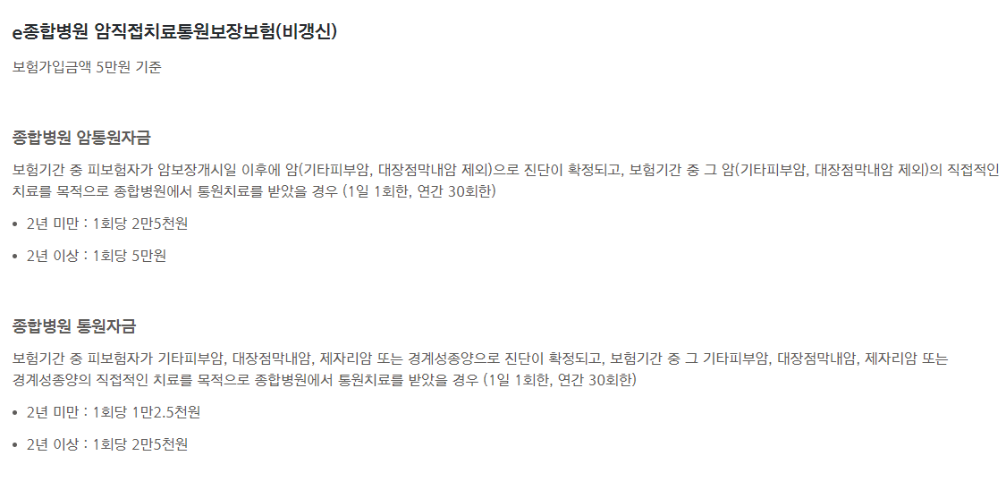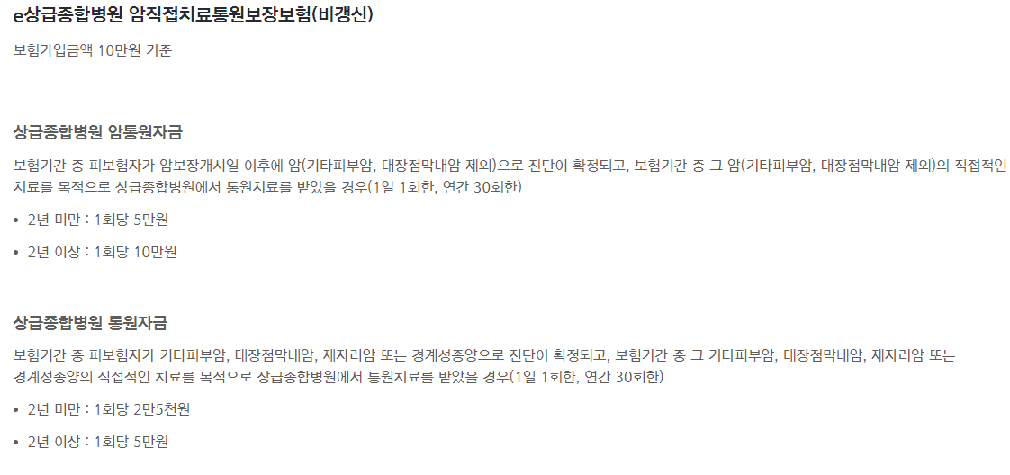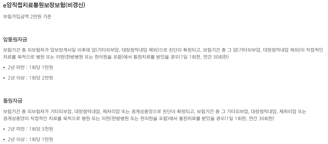 - 대장점막내암 진단자금 : 보험기간 중 피보험자가 대장점막내암으로 진단이 확정되었을 경우 (최초 1회 한, 2년 미만 100만 원, 2년 이상 200만 원)