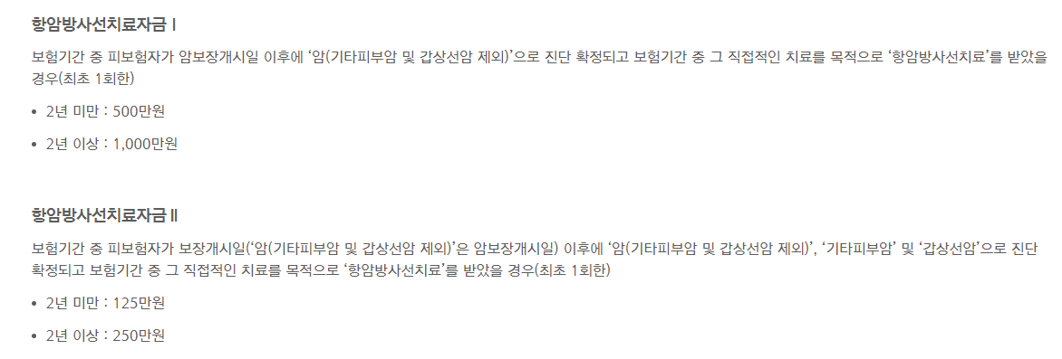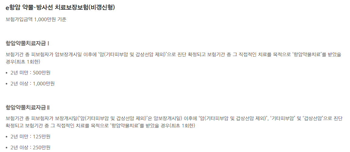 - 암 진단자금 : 보험기간 중 암보장개시일 이후 피보험자가 암으로 진단이 확정되었을 경우 (최초 1회 한, 2년 미만 500만 원, 2년 이상 1000만 원)