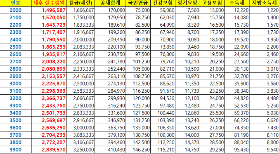 연봉 실수령액 2000만원 ~ 3900만원