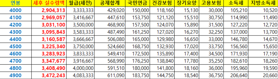 연봉 실수령액 4000만원 ~ 4900만원