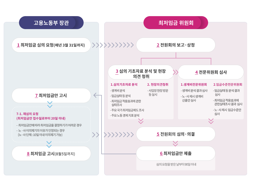 - 7-1 최저임금법 제8조 제3항에 따라 위원회가 제출한 최저임금안에 따라 최저임금을 결정하기가 어렵다고 인정되거나 법 제9조에 따라 근로자를 대표하는 자 또는 사용자를 대표하는 자가 최저임금안이 고시된 날로부터 10일 이내에 장관에게 이의를 제기하고 그 이유가 있다고 인정되는 경우, 장관은 20일 이내에 그 이유를 밝혀 위원회에 10일 이상의 기간을 정하여 재심의 요청을 한다.