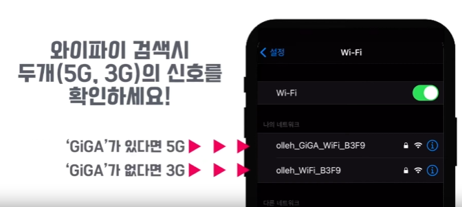 - 5G는 간섭 없이 빠른 속도로 이용가능하지만, 커버할 수 있는 공간이 2G에 비해 짧다고 합니다. 그렇기 때문에 kt인터넷 끊김 현상이 있다면 2G로 변경하거나 방이 아닌 와이파이 근처에서 5G를 선택하여 사용하길 권장드립니다.